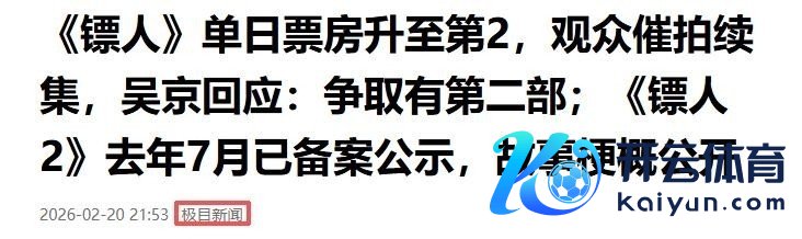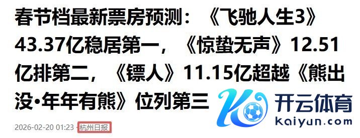 部分参考贵寓:1、春节档最新票房猜度:《飞奔东谈主生3》43.37亿稳居第一,《惊蛰无声》12.51亿排第二,《镖东谈主》11.15亿相当《熊出没·年年有熊》位列第三.杭州日报2、2026春节档过半票房超31亿 《镖东谈主》票房逆跌或凭口碑逆袭.封面新闻3、《镖东谈主》单日票房升至第2,不雅众催拍续集,吴京回应:争取有第二部;《镖东谈主2》客岁7月已备案公示,故事约莫公开.极目新闻