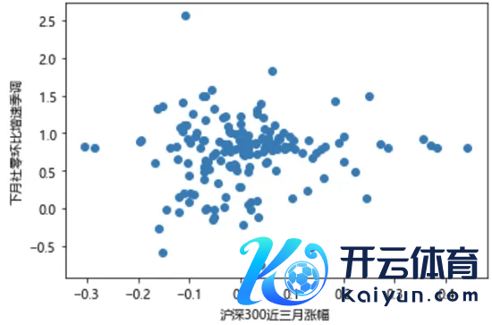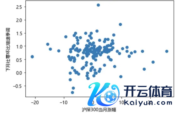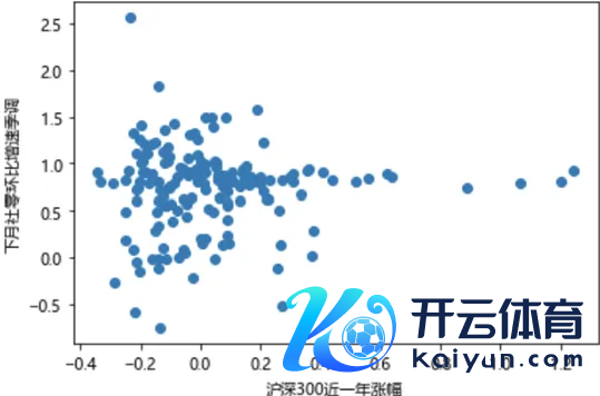 数据取样时辰从2011年2月到2024年10月,沪深300指数辞别为畴昔一个月、三个月、半年、一年的涨跌幅与下一个月的社零环比增速(季调)组成散点图。