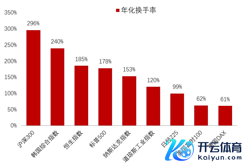 取2022年年头至本年3季度末的沪深300股票的年化换手率与同期的全球主要指数对应的股票年化换手率,则沪深300的年化换手率接近3倍,标普500为1.78倍,纳斯达克指数为1.53倍。而畴昔三年阐述较高的日经225的年化换手率唯一1倍。