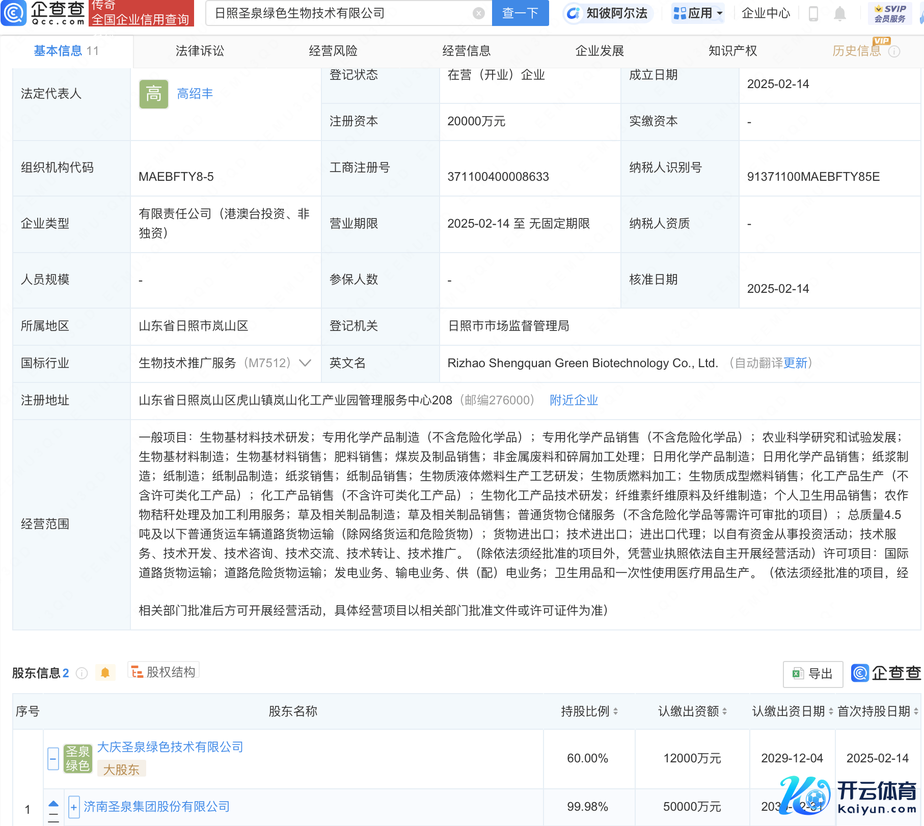 企查查APP显现,近日开云体育(中国)官方网站,日照圣泉绿色生物技巧有限公司设置,法定代表东说念主为高绍丰,注册成本2亿元,计较领域包含:农业科学筹商和训诫发展;生物基材料制造;生物基材料销售;肥料销售等。企查查股权穿透显现,该公司由圣泉集团(605589)旗下大庆圣泉绿色技巧有限公司等共同握股。