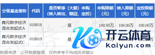 本站音书,9月24日鑫元基金惩办有限公司发布《对于鑫元数字经济夹杂型发起式证券投资基金暂停大额申购(调遣转入、如期定额投资)业务的公告》。公告中教唆,为保护基金份额捏有东谈主利益,自2025年9月24日起鑫元数字经济夹杂型发起式证券投资基金暂停大额申购(调遣转入、如期定额投资)业务,申购、调遣转入上限金额为100.0万元,下属分级基金解救明细如下: